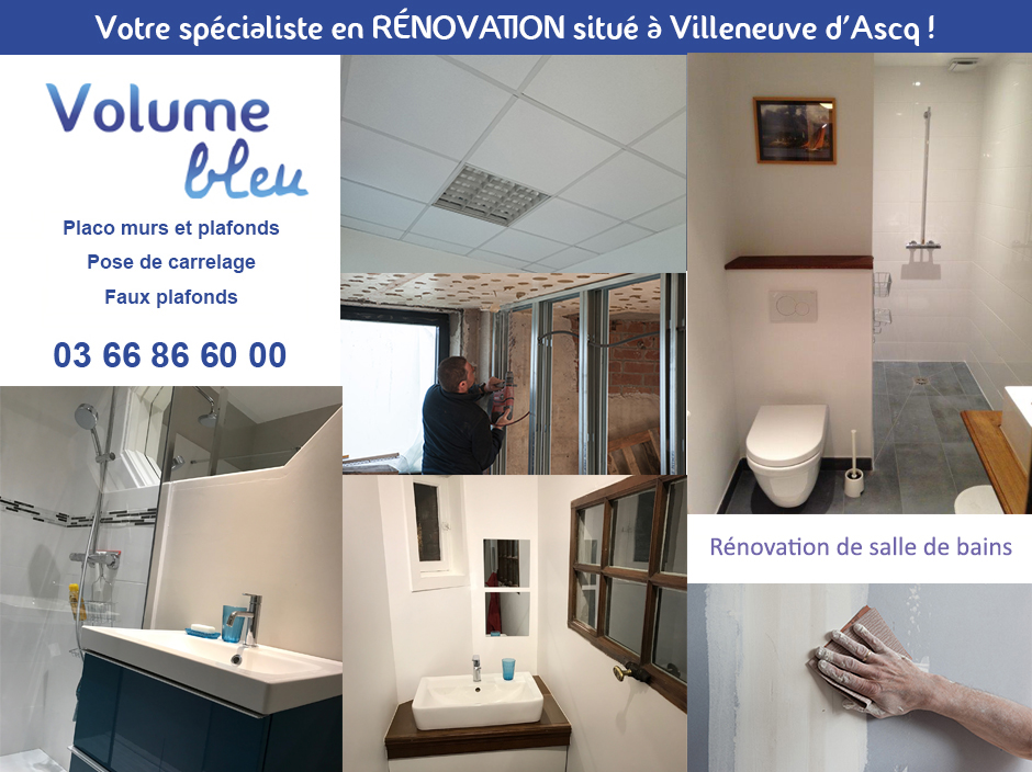 Volume bleu, entreprise spécialisée dans la rénovation intérieure vous conseille et vous accompagne dans la pose de placo murs et plafond, revêtement sol : carrelage, pose de faux plafonds, rénovation de salle de bains, ….